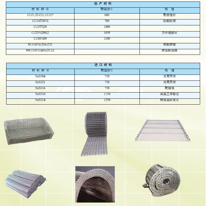 本公司生產(chǎn)的金屬網(wǎng)帶生產(chǎn)工藝先進(jìn),選材合理、品種規(guī)格齊全,有人字形、網(wǎng)狀形、方孔形等,是目前國內(nèi)熱處理、粉末冶金、化纖和玻璃二次加工等行業(yè)自動生產(chǎn)線中的關(guān)鍵配件。